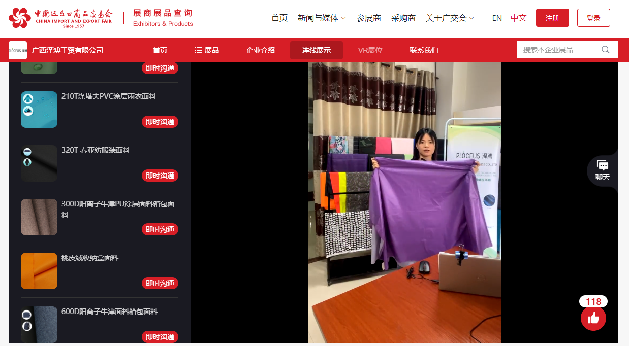 園區(qū)企業(yè)廣西澤溥工貿(mào)有限公司云上參展,通過直播形式進(jìn)行商品展出。公司此前曾多次參加廣交會,并收獲不少新客戶、新訂單,線上廣交會解決了企業(yè)在疫情下無法赴海外參加專業(yè)展會的問題,每年的云上參展結(jié)識了更多的海外客戶。